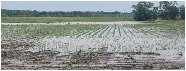 *The evening after Neitzel spoke with us, a heavy rain totaling 4 1/2 inches fell on his farm. The photo shows the impact on a replanted cornfield.